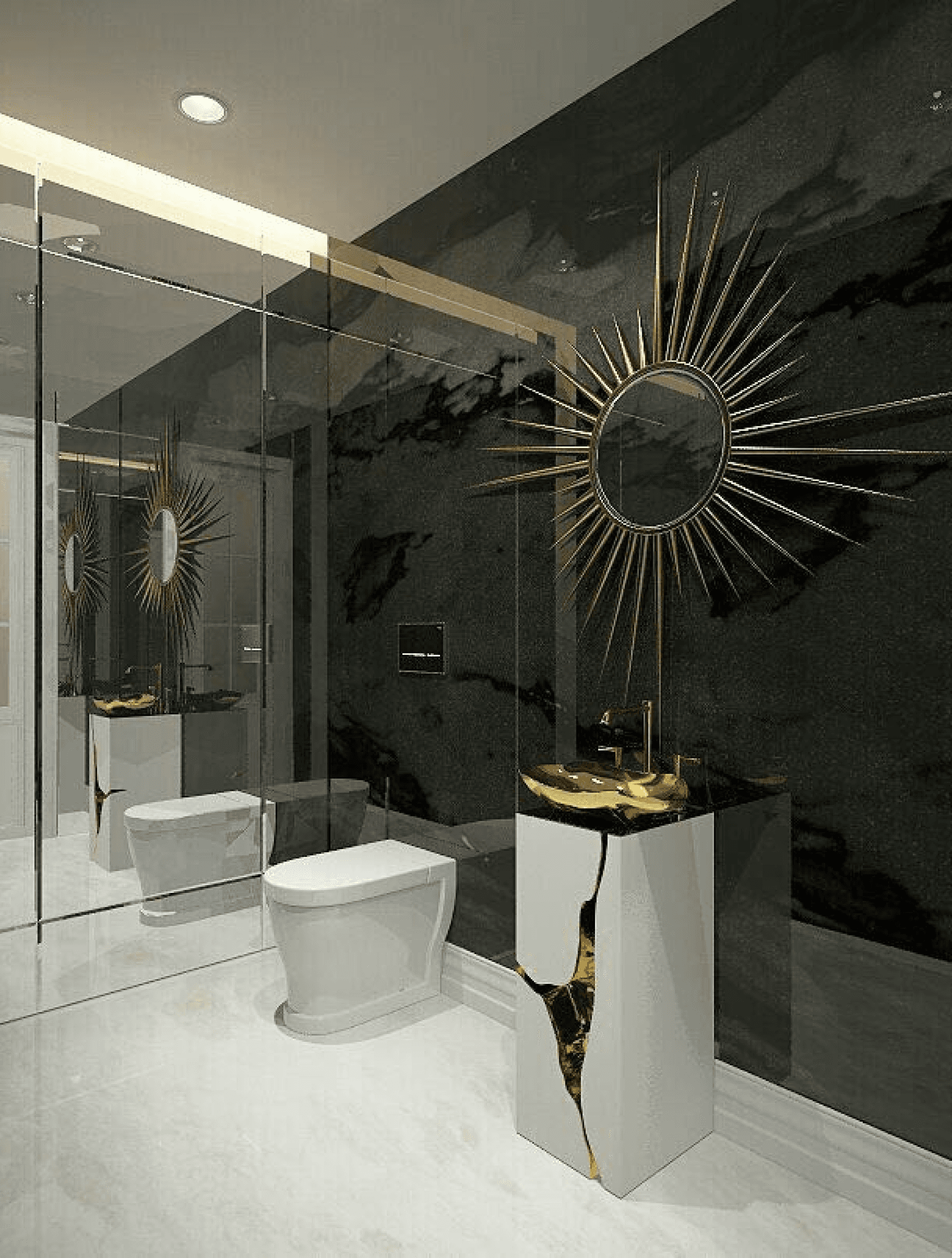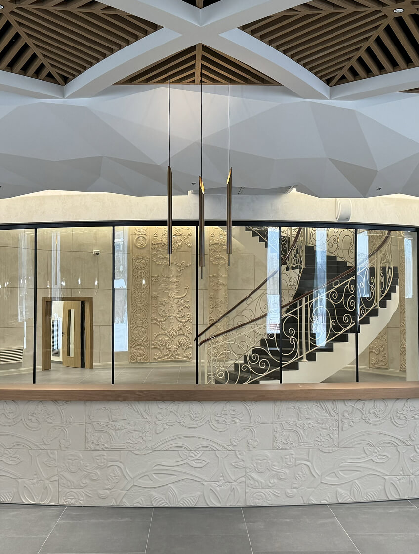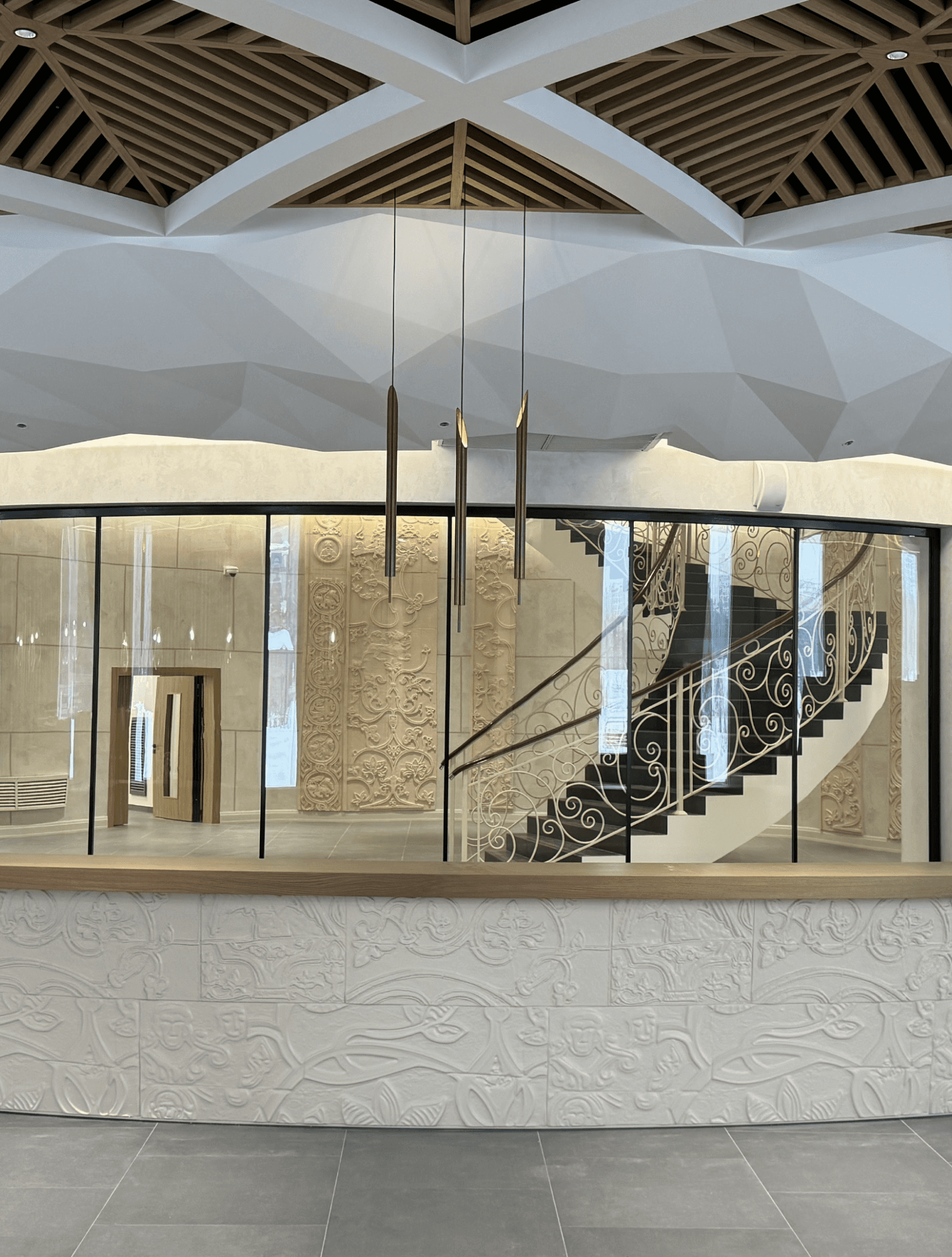 Трёхэтажный коттедж. Отделка под мрамор и домашний кинотеатр с диванами и приглушенным освещением